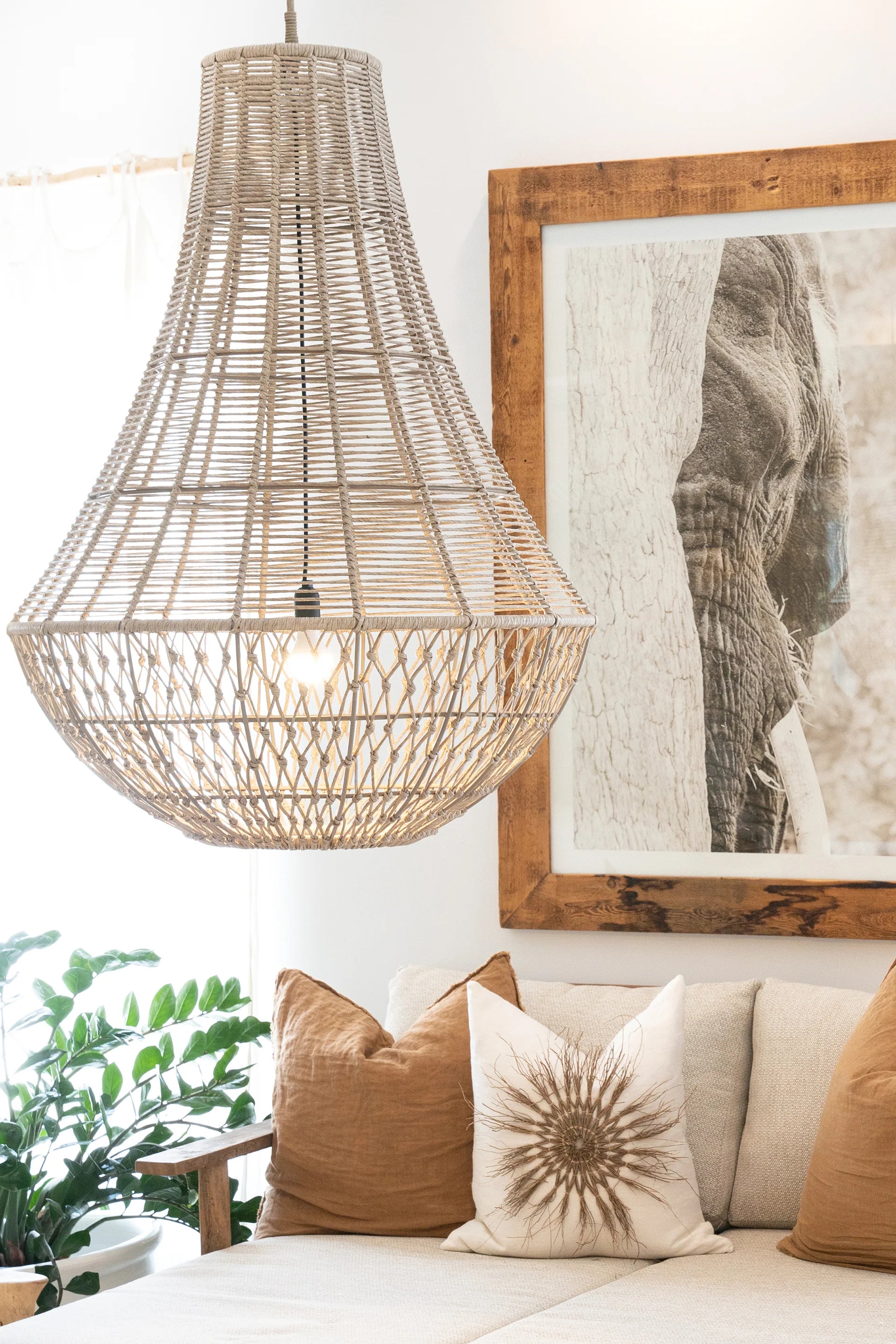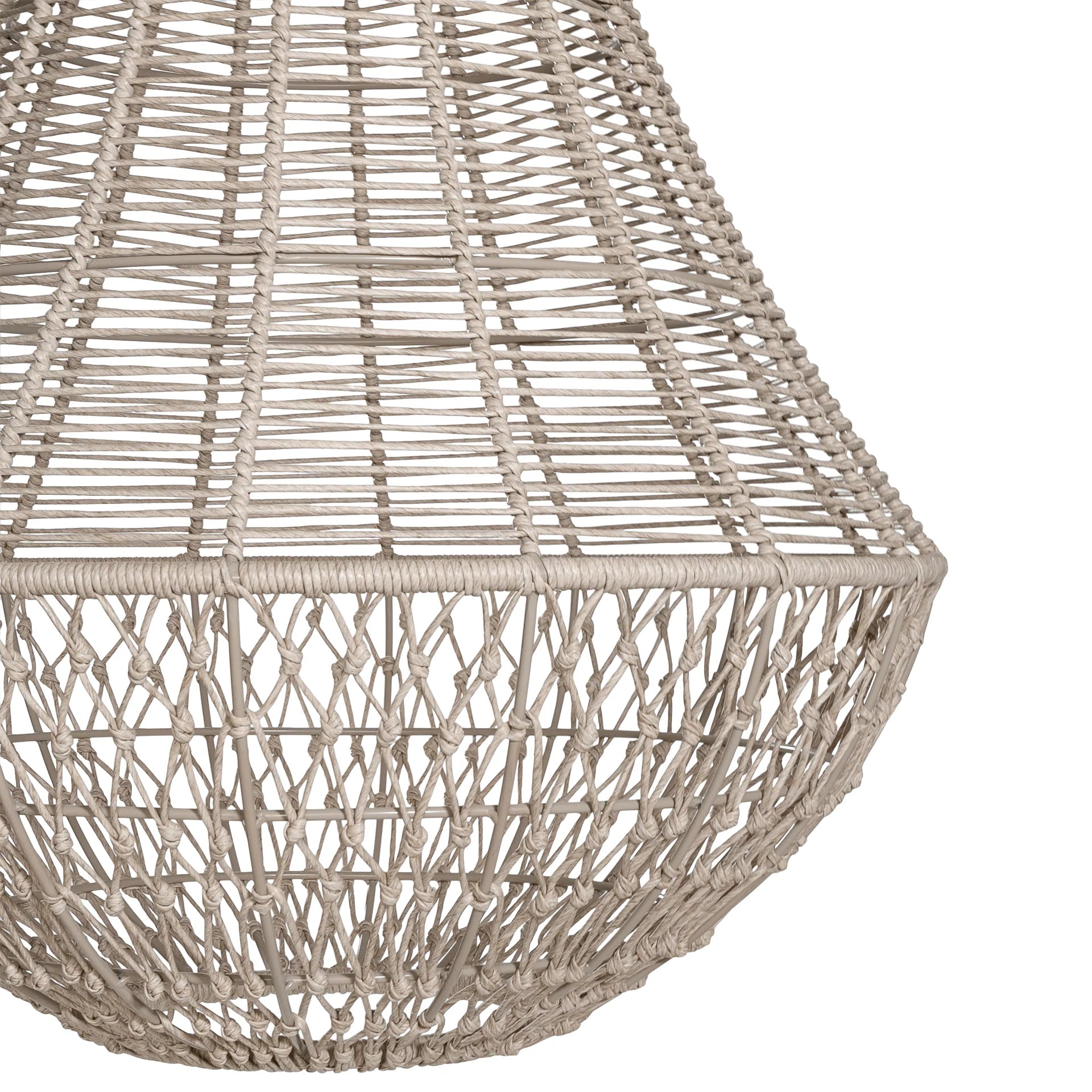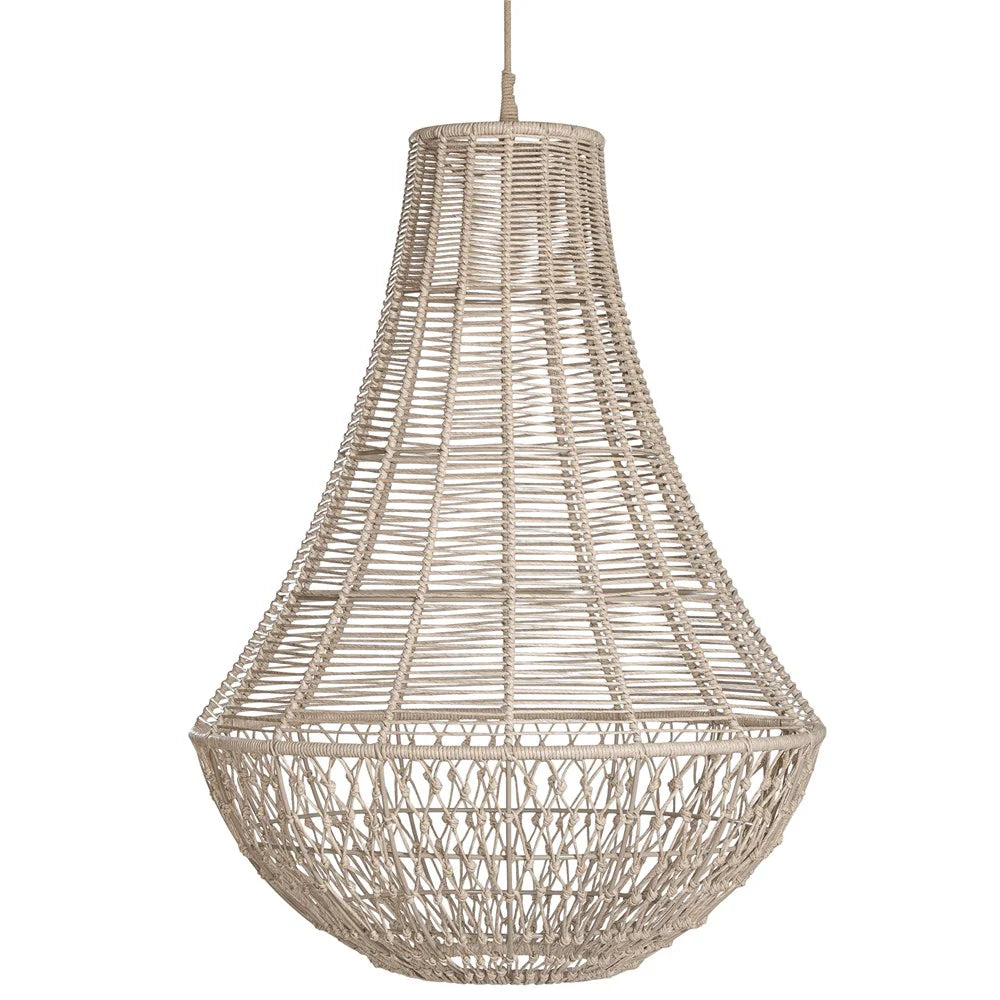 A modern take on a traditional chandelier, this beautiful outdoor pendant is handcrafted using taupe-coloured polyhyacinth, woven and twisted into place around a durable and structured dome-shaped aluminium frame.