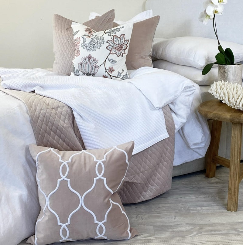Ultra soft pink velvet with contrasting white embroidery will make a bold statement in any home. Ideal when combined with our Rodeo collection.