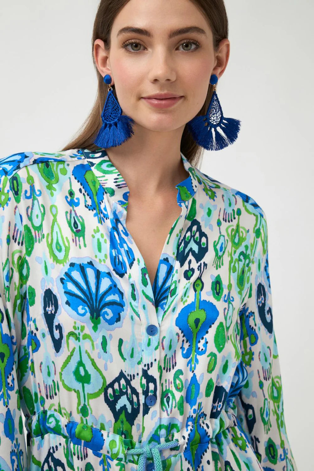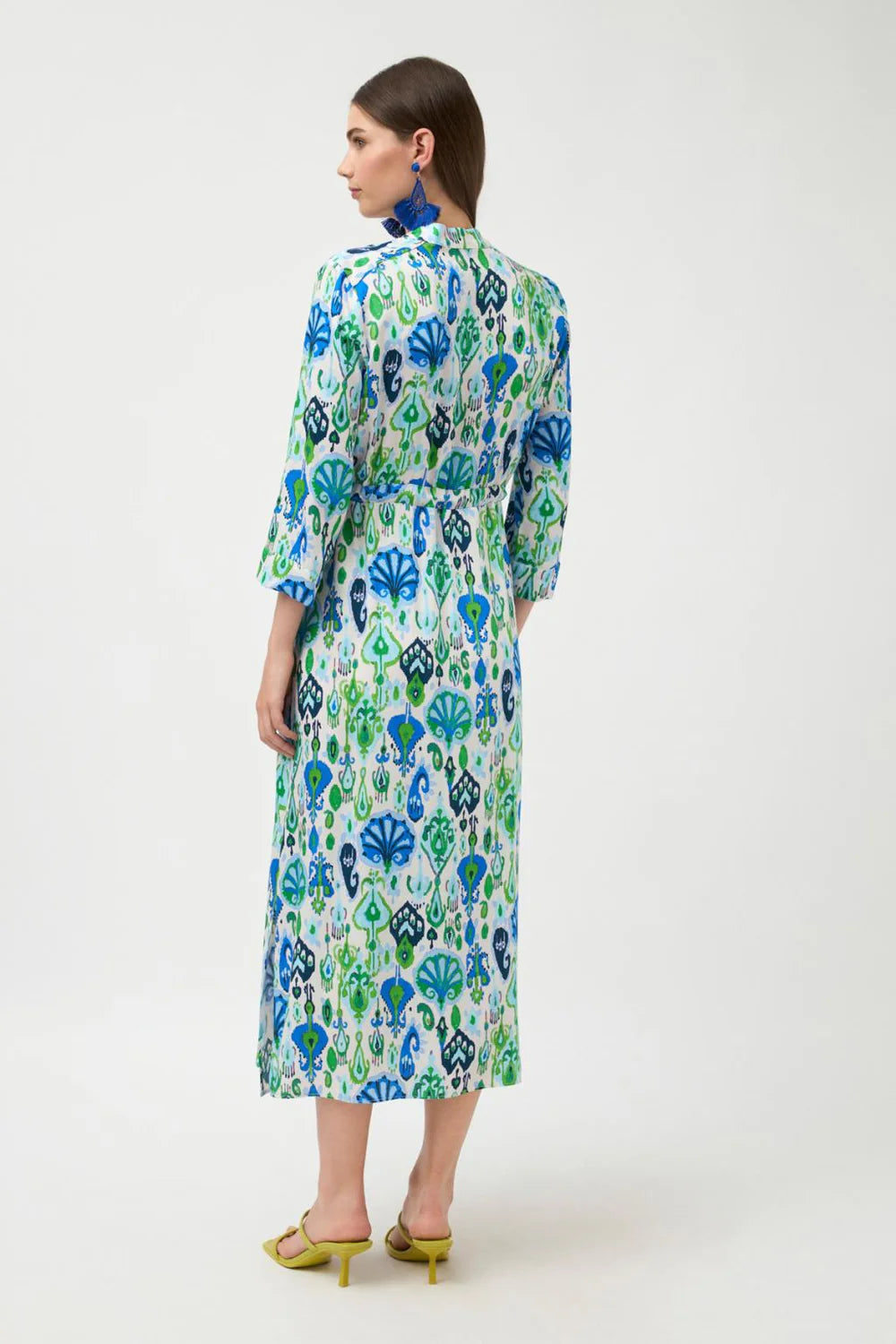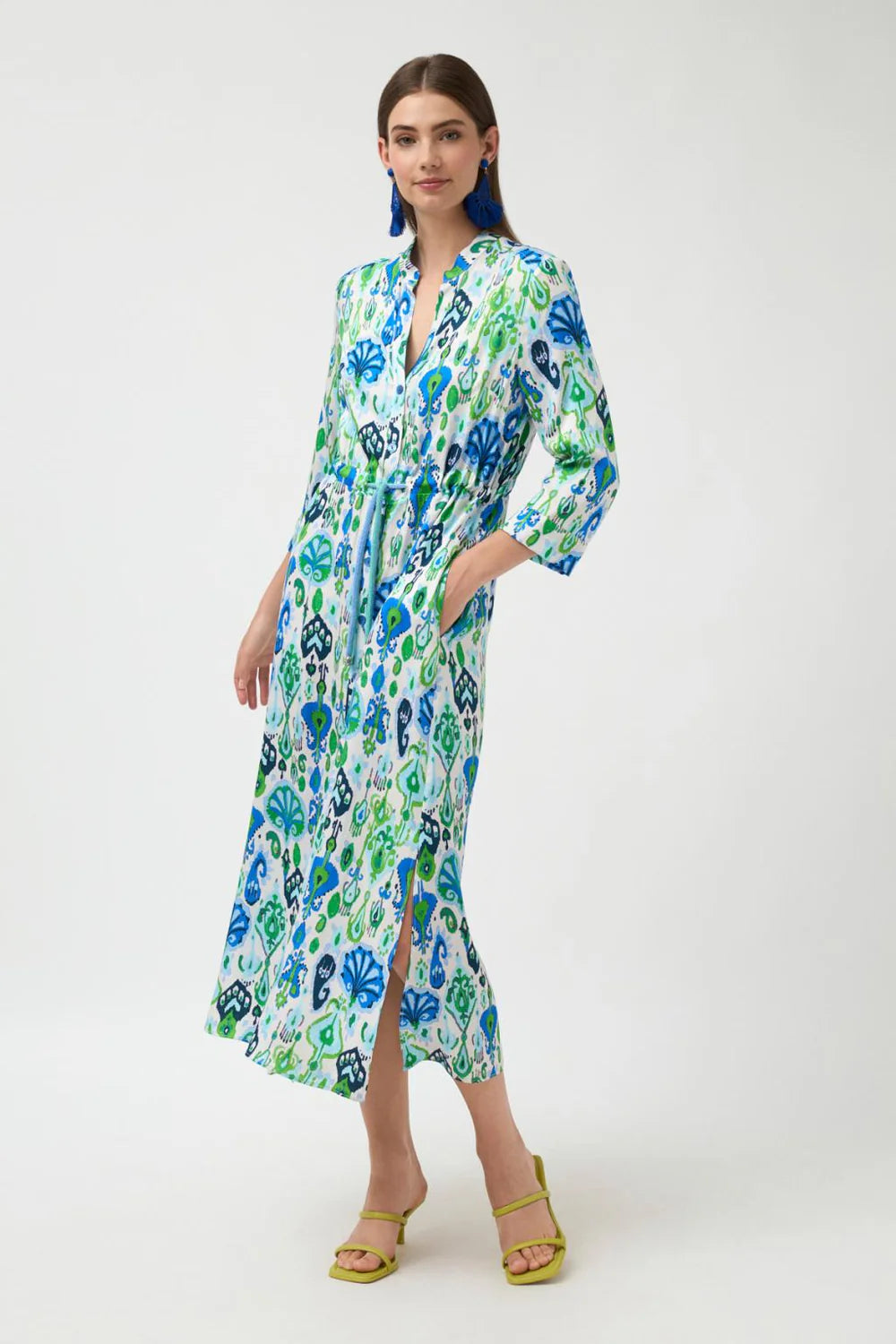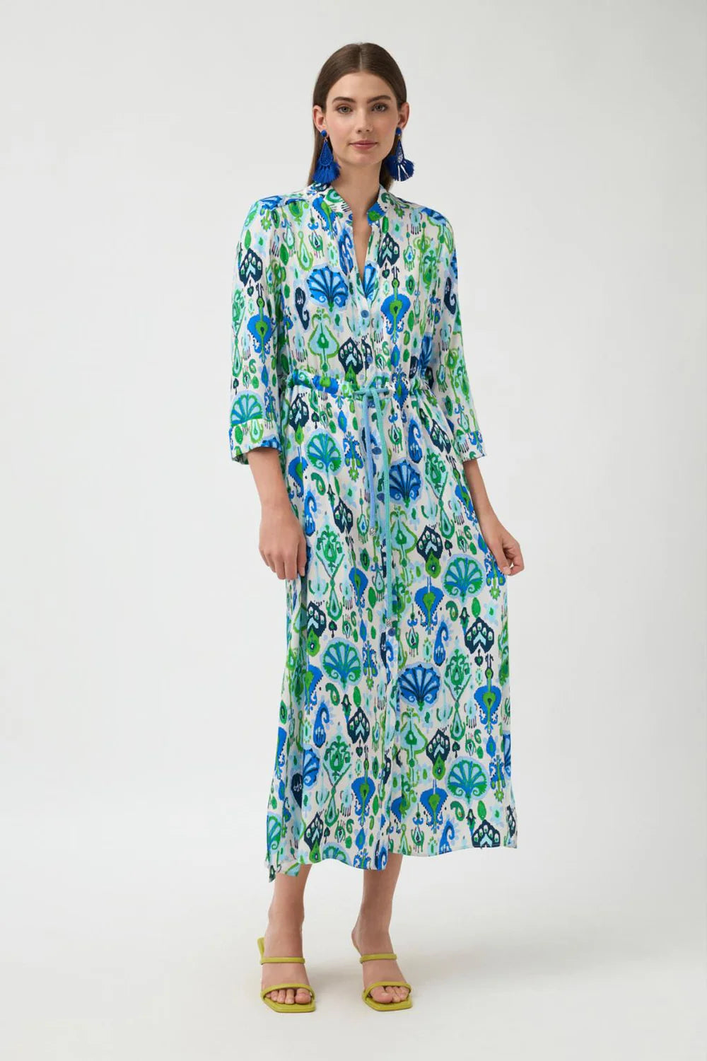 Flowing printed long shirt dress crafted from a soft, airy fabric. The silhouette is cinched at the waist with a cord belt, complemented by a mandarin collar opening into a graceful V-neckline and a button-down front. Finished with fluid three-quarter sleeves, and a straight hem with side slits for effortless movement.